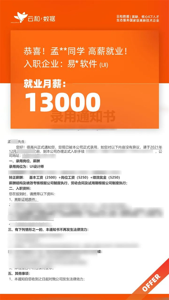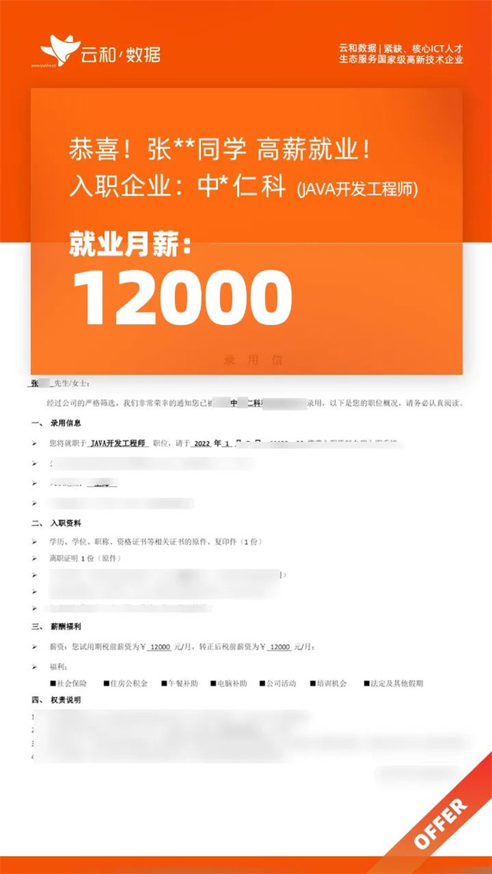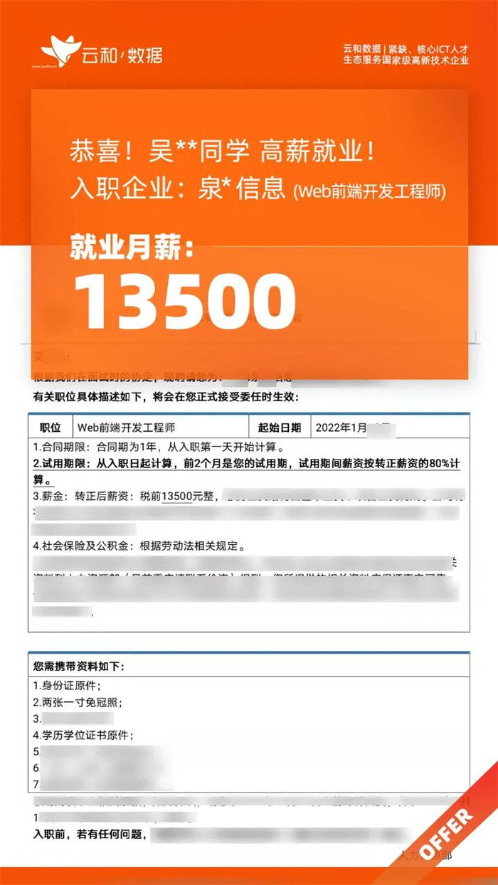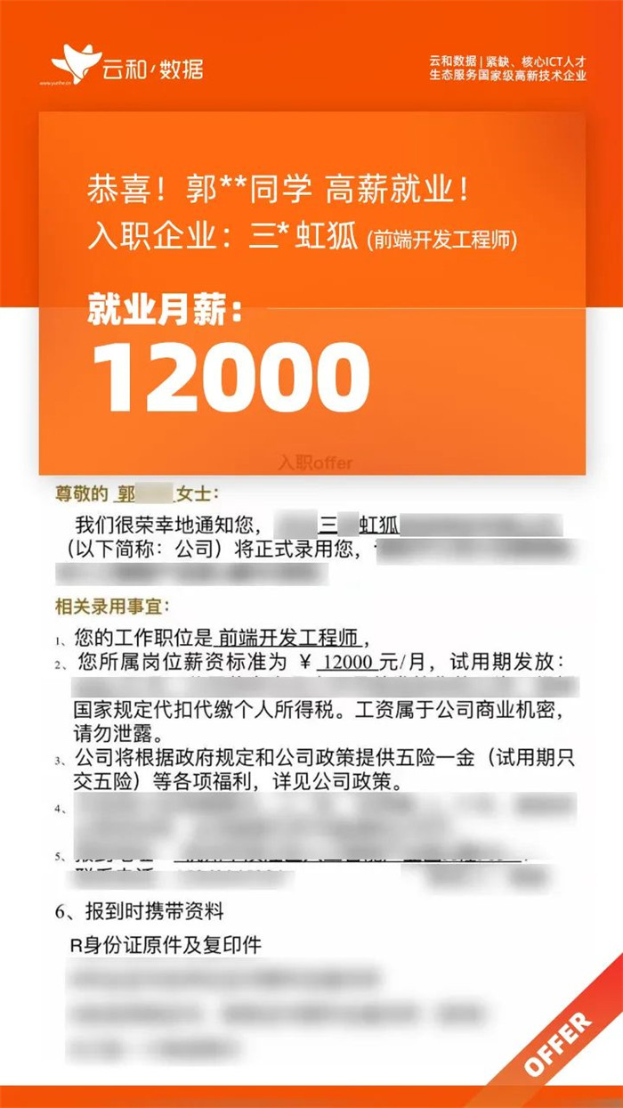 云和数据ICT职业教育发挥公司产业化优势与技术积淀,整合国内外优秀师资,累计自主研发140余项教辅、教材,115项实践教学实训平台,采用六位一体项目制教学模式,年培养高端ICT技术人才超10000人,其中线下ICT职业教育5500余人,累计为企业输送高端泛ICT技术人才超8万人,60%来自于口碑推荐。更大规模、更多人选择;更好的ICT学习、更好的就业。云和数据人才培养技术方向涵盖大数据、云计算、人工智能、虚拟现实、JAVA软件工程、UI用户体验设计、Web前端开发、网络安全八大方向,云和数据以八大精品课程为基础,八大就业基地为依托,一次就业率99.02%,61.9%就业薪资超1W,以大数据为首的精品专业平均薪资13.25K。