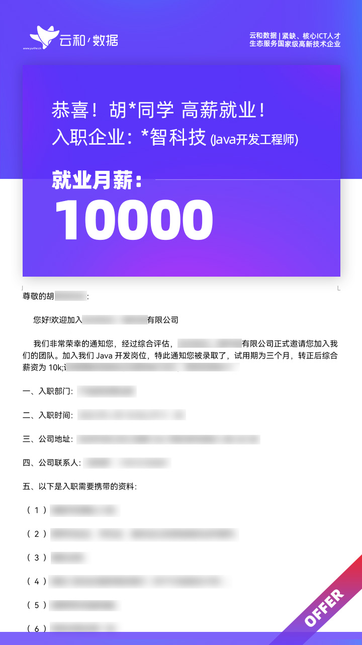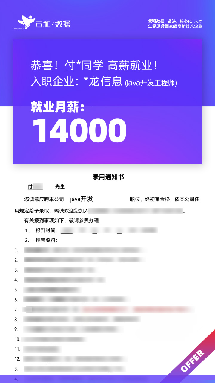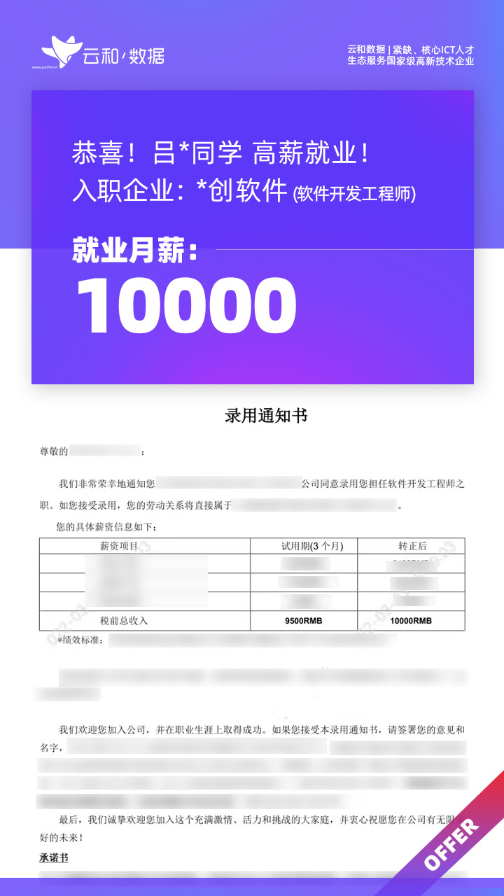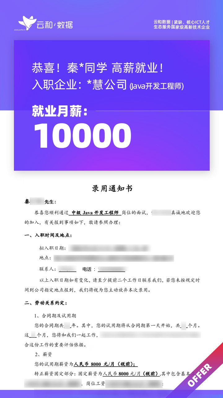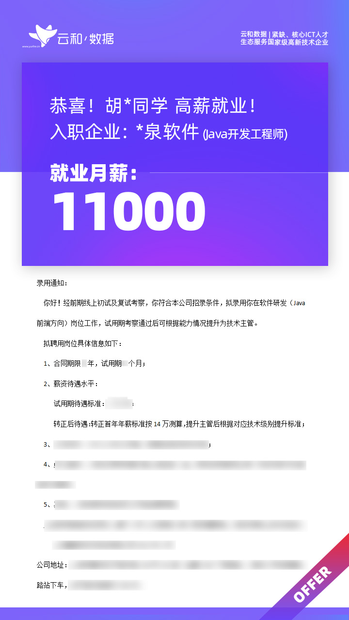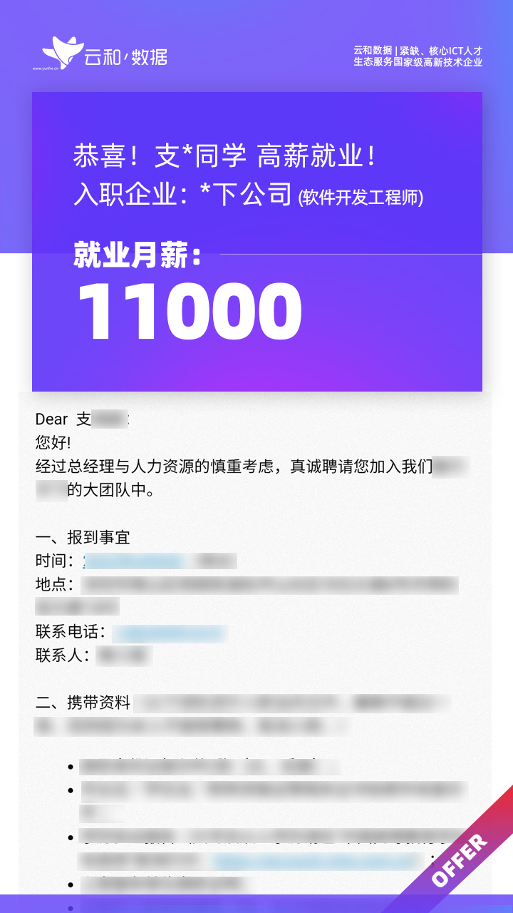 云和数据ICT职业教育发挥公司产业化优势与技术积淀,整合国内外优秀师资,累计自主研发140余项教辅、教材,115项实践教学实训平台,采用六位一体项目制教学模式,年培养高端ICT技术人才超10000人,其中线下ICT职业教育5500余人,累计为企业输送高端泛ICT技术人才超8万人,60%来自于口碑推荐。更大规模、更多人选择;更好的ICT学习、更好的就业。云和数据人才培养技术方向涵盖大数据、云计算、人工智能、虚拟现实、JAVA软件工程、UI用户体验设计、Web前端开发、网络安全八大方向,云和数据以八大精品课程为基础,八大就业基地为依托,一次就业率99.02%,61.9%就业薪资超1W,以大数据为首的精品专业平均薪资13.25K。