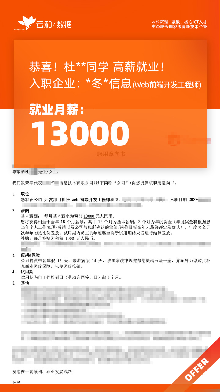 云和数据ICT职业教育发挥公司产业化优势与技术积淀,整合国内外优秀师资,累计自主研发140余项教辅、教材,115项实践教学实训平台,采用六位一体项目制教学模式,年培养高端ICT技术人才超10000人,其中线下ICT职业教育5500余人,累计为企业输送高端泛ICT技术人才超8万人,60%来自于口碑推荐。更大规模、更多人选择;更好的ICT学习、更好的就业。云和数据人才培养技术方向涵盖大数据、云计算、人工智能、虚拟现实、JAVA软件工程、UI用户体验设计、Web前端开发、网络安全八大方向,云和数据以八大精品课程为基础,八大就业基地为依托,一次就业率99.02%,61.9%就业薪资超1W,以大数据为首的精品专业平均薪资13.25K。