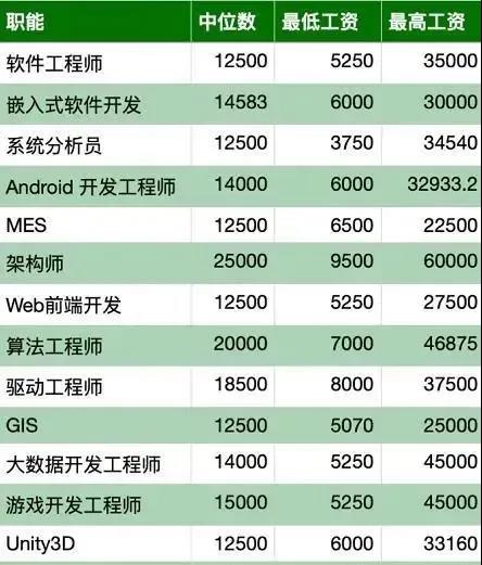 从职位上来看,各个职位的薪资差别挺大。架构师以及从事算法的平均工资达到了2.5w,最高工资有6w之多。当然这类岗位的要求相对较高,没有多年的技术经验,很难胜任这样的工作。除了这几个薪资相对比较高的岗位,其他岗位的薪资也都还是不错的。这些职位的平均工资最低的都有1.25w,最高的工资一般都是3w+。话说回来,薪资水平和很多因素有关,比如取决于每年行业对岗位的需求度、取决于该岗位的人才量、取决于个人的专业技能。程序员都是爱学习,敢于突破舒适圈的,只要保证技能与时俱进,工资是不会低的。一句话,与众多其他行业来比较,程序员工资确实是高薪的代表!
