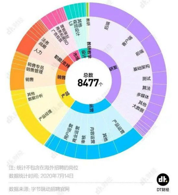 在字节跳动官网发布的8000多个招聘岗位中,研发占到了近4成的比例。作为一家以算法著称的互联网科技公司,字节跳动招聘的一大主力仍是技术人才。