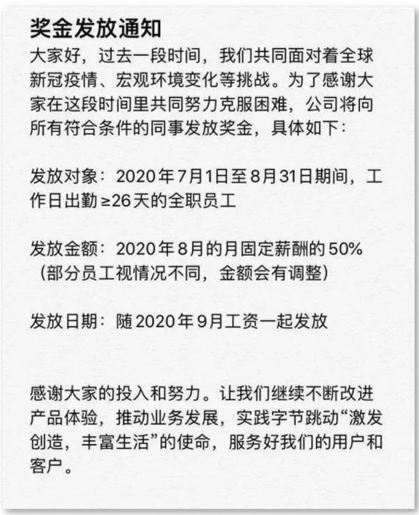 近期,字节跳动发布邮件,宣布给员工发放奖金,金额为2020年8月固定薪酬的50%。凡是2020年7月1日至8月31日期间,工作日出勤超过(包含)26天的全职员工均可获得该奖金。这笔奖金随2020年9月工资一起发放。