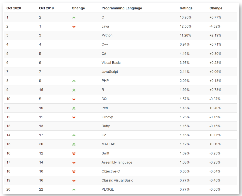 2020年10月TIOBE编程语言排行榜最新出炉,C语言、Java、Python排名前三!