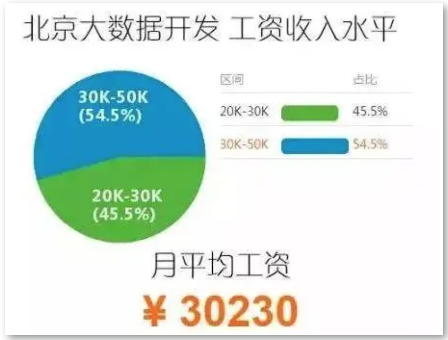由于人才稀缺,优秀人才薪资更为可观,目前人才市场上45%大数据人才的月薪在20-30k之间,54%的大数据从业者甚至月薪达到30-50k之多。