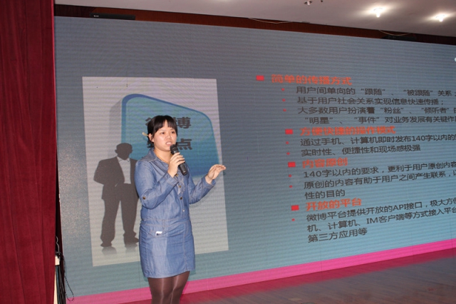 薛老师以《微博营销与策划》为主题,为与会人员分享了微博的运营与推广策略。她从大家的微博应用习惯着手,结合互联网+的时代环境,深入浅出的教大家如何利用碎片化时间,运用微话题、微公关、微互动、微应用、微访谈等途径打造自己的自媒体风格,将弱关系强传播的微博变成一个具有品牌影响力的自我展示平台。整个过程中,薛老师妙语连珠、干货不断,让大家深感收获颇丰。